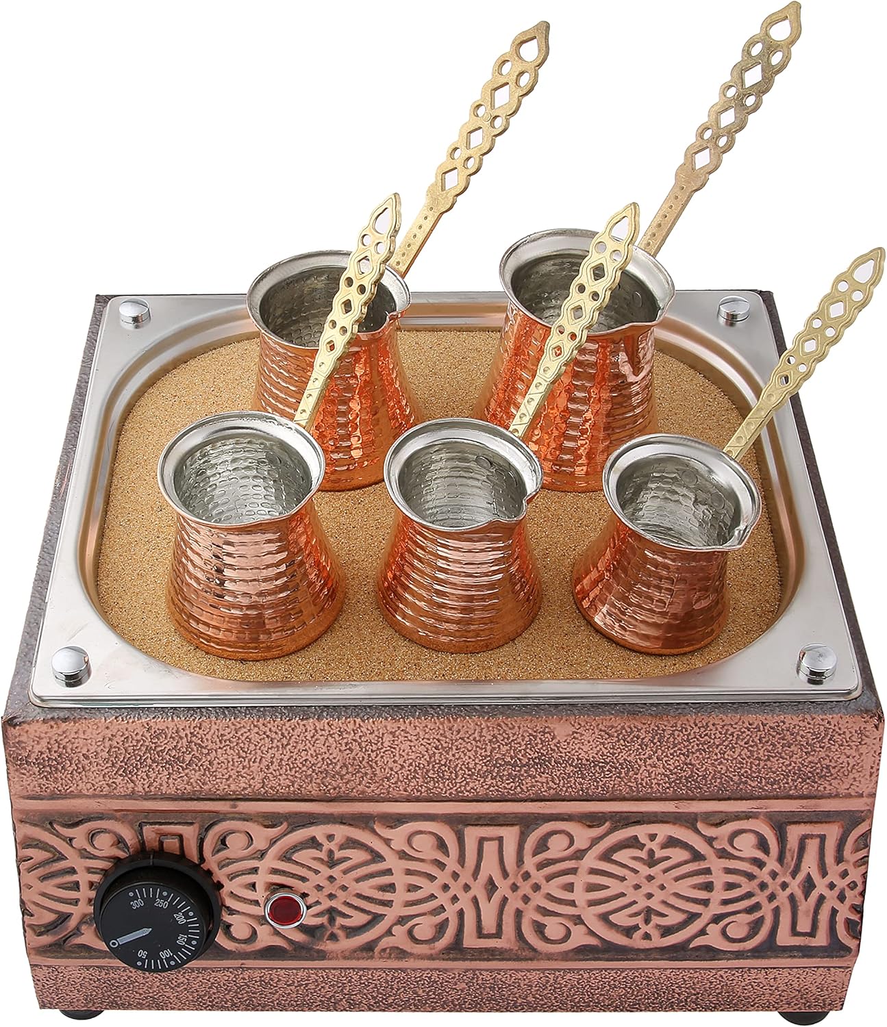 Package includes: 1x Electric Copper Coated Coffee Maker Machine, 3x ( pack ) Sand, And 5 Sizes copper Pots and 1x100gram Turkish Coffee as a Gift.
