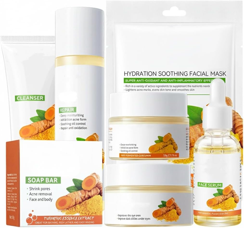 This 7 piece Turmeric Skin Care Set is the great way to treat your skin to the nourishing, anti-aging benefits of turmeric. The kit includes all the essential products to build a complete skincare routine, including a face wash, soap, toner, serum, eye cream, face cream, and mask. Whether you’re looking to hydrate, brighten, or smooth your skin, this set has everything you need to maintain a healthy, glowing complexion.