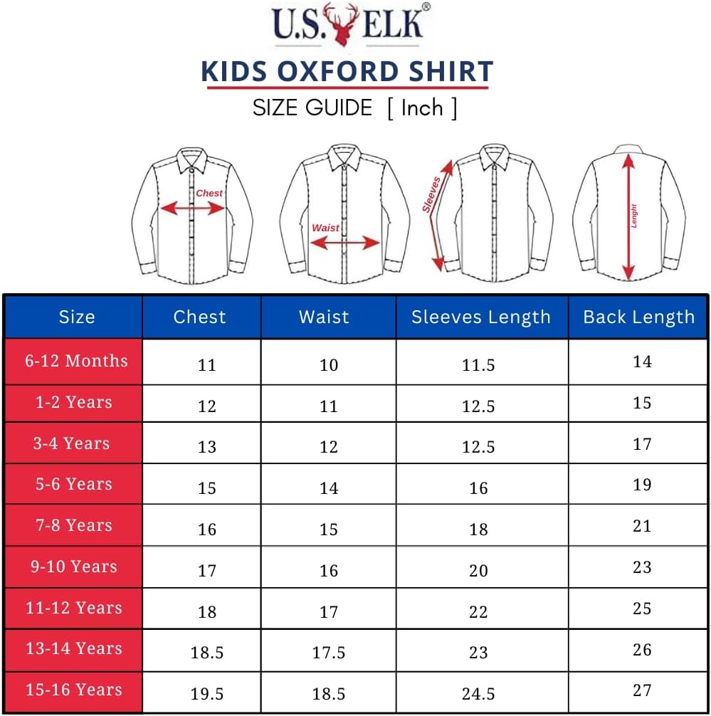 U.S. ELK comfortable and style boys dress shirt is made of high-quality cotton fabric. This breathable and soft material ensures easy movement and enhanced comfort throughout the day. Designed with versatility in mind, our shirt features a classic collared neck, long sleeves, perfectly blending fashion with functionality. The button-down style adds elegance, perfect for any occasion, whether formal or casual. Boys’ Button Down Dress Shirts exude timeless style, effortlessly pairing with any outfit, whether worn casually or formally. For added convenience, our formal shirt is easy to care for. Simply hand wash or machine wash cold, avoiding bleaching, and tumble dry on a low setting. If necessary, use a low iron to maintain its quality and appearance, ensuring your child looks sharp and stylish at all times.