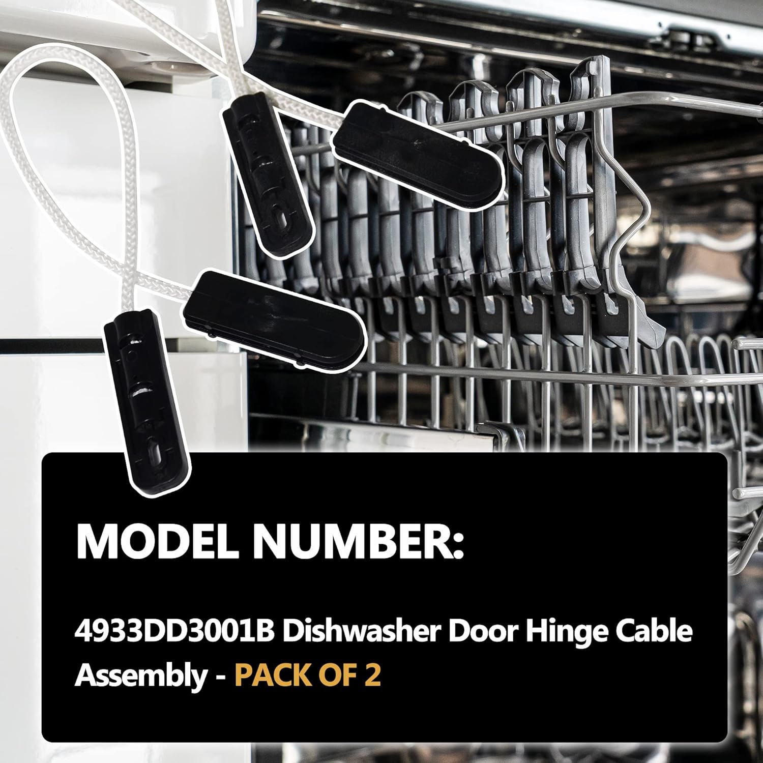The 4933DD3001B Dishwasher Door Hinge Cable Assembly (pack of 2) connects the door to the spring. The door hinge cable and the door spring apply tension to the door to prevent it from dropping open too quickly. This part contains two plastic pieces which are approximately 2 inches in length by 3/4-inch in width, as well as a rope portion that measures approximately 8 inches in length.