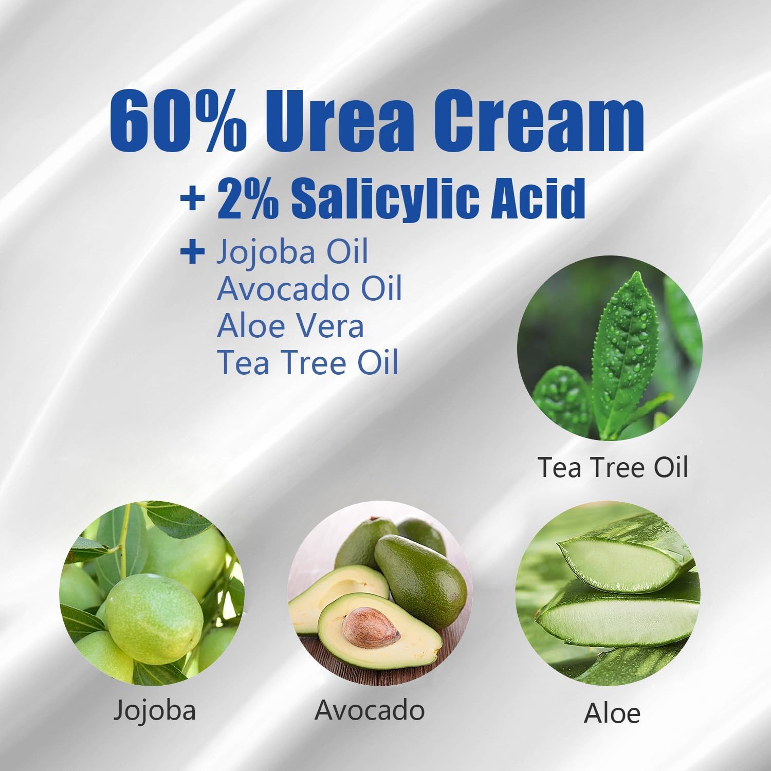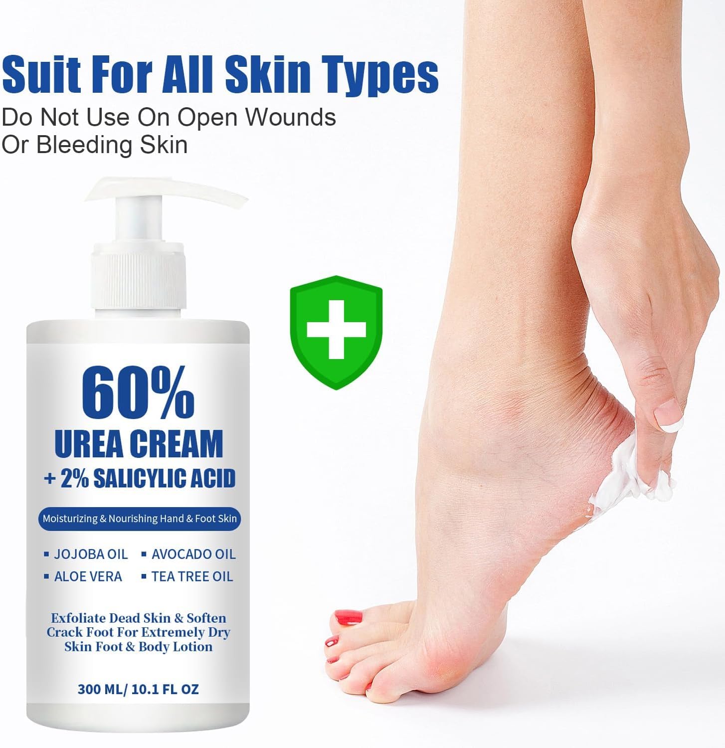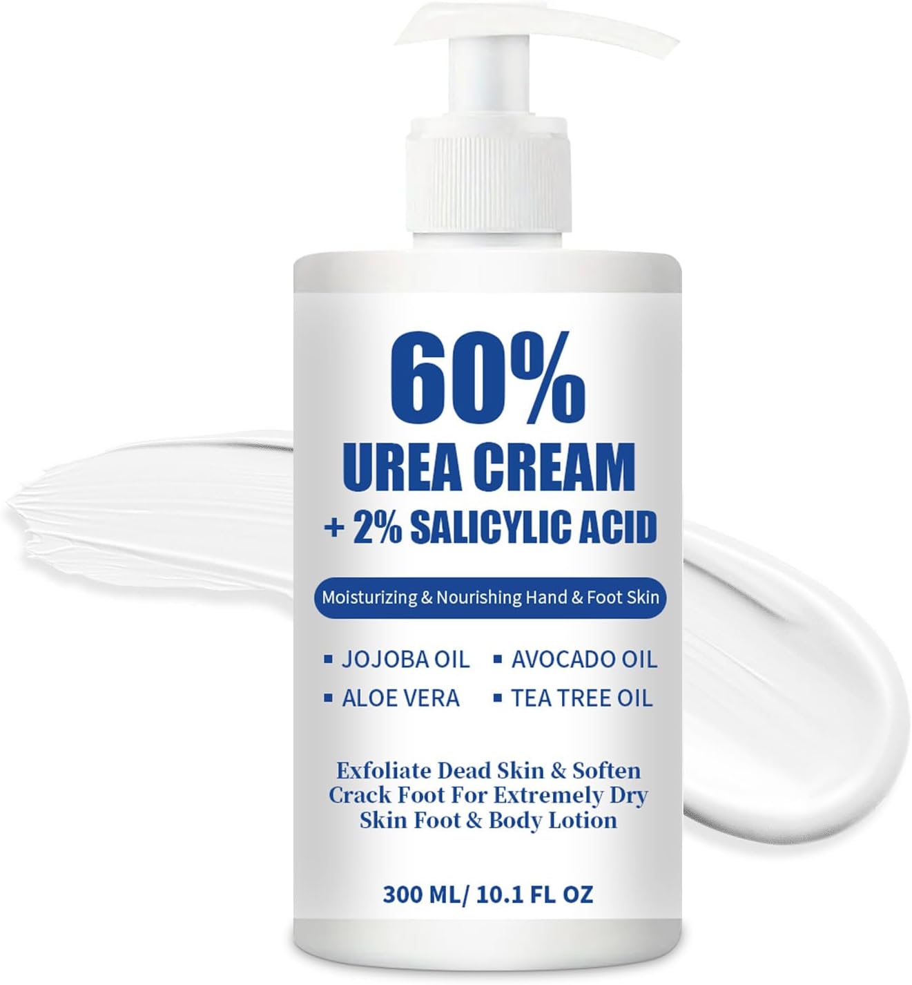 Urea and Salicylic Acid: A high concentration of 60% urea is effective for treating extremely dry and cracked skin, providing deep hydration and softening the outer layer while reducing callused areas. 2% salicylic acid helps remove dead skin cells from the surface, smoothing the skin.