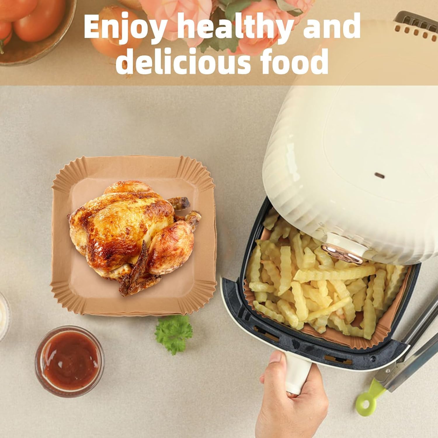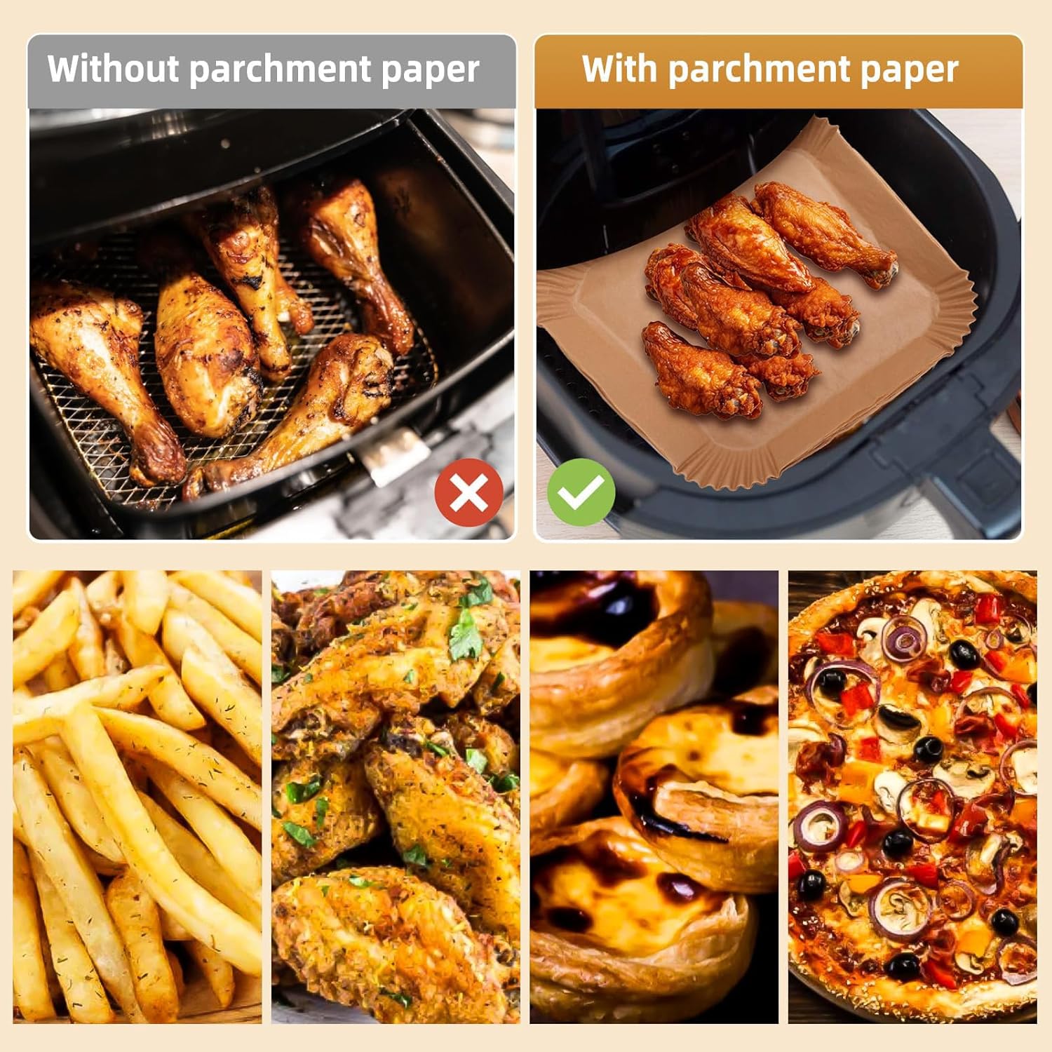 🍗【Non-Stick Coating】: The air fryer paper features a non-stick coating that prevents food from sticking. This feature makes cleaning a breeze and guarantees no residue. Enjoy crispy and delicious meals with the confidence of a clean outcome.