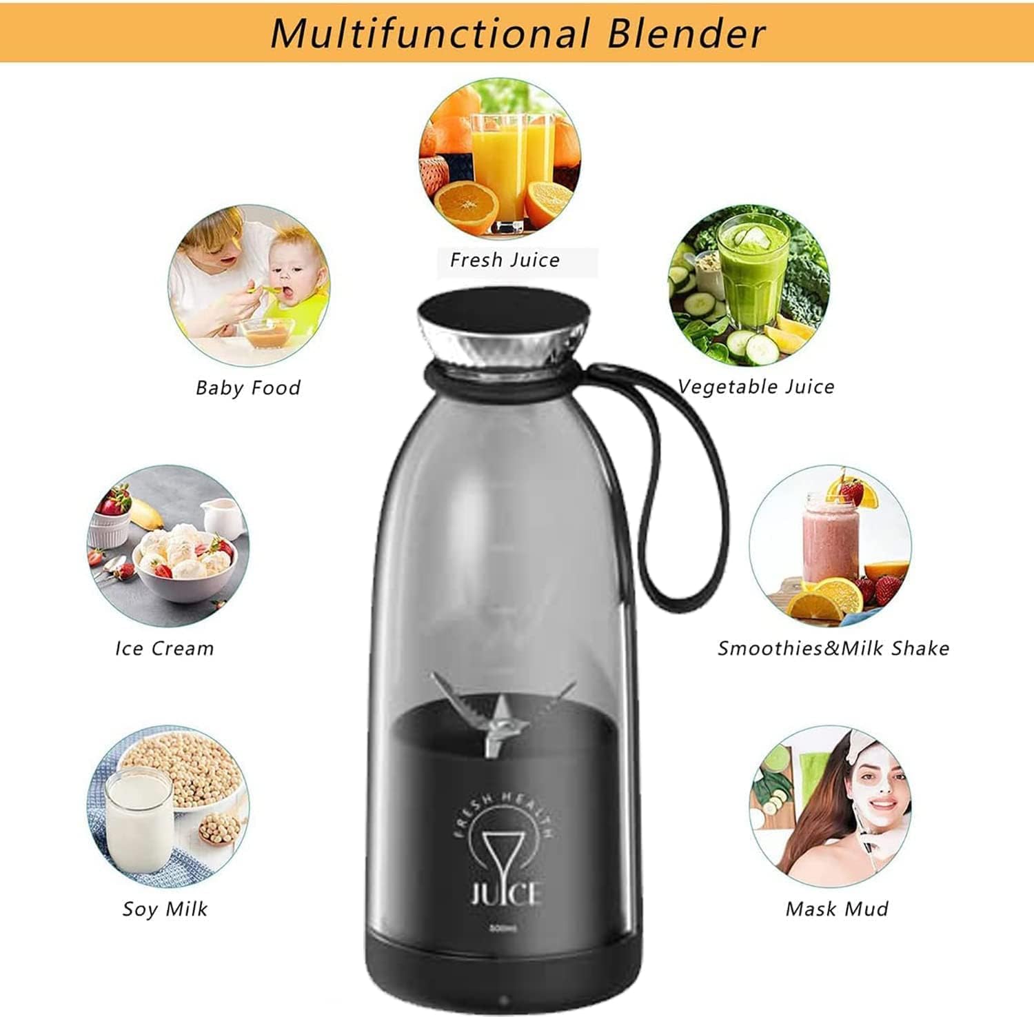 Meet YelaJoy Portable Blender: Your 500ml on-the-go solution! Equipped with 4 stainless steel blades and a 200W motor, it crushes ice/fruits in 30 seconds while locking dietary fiber for silky-smooth shakes.