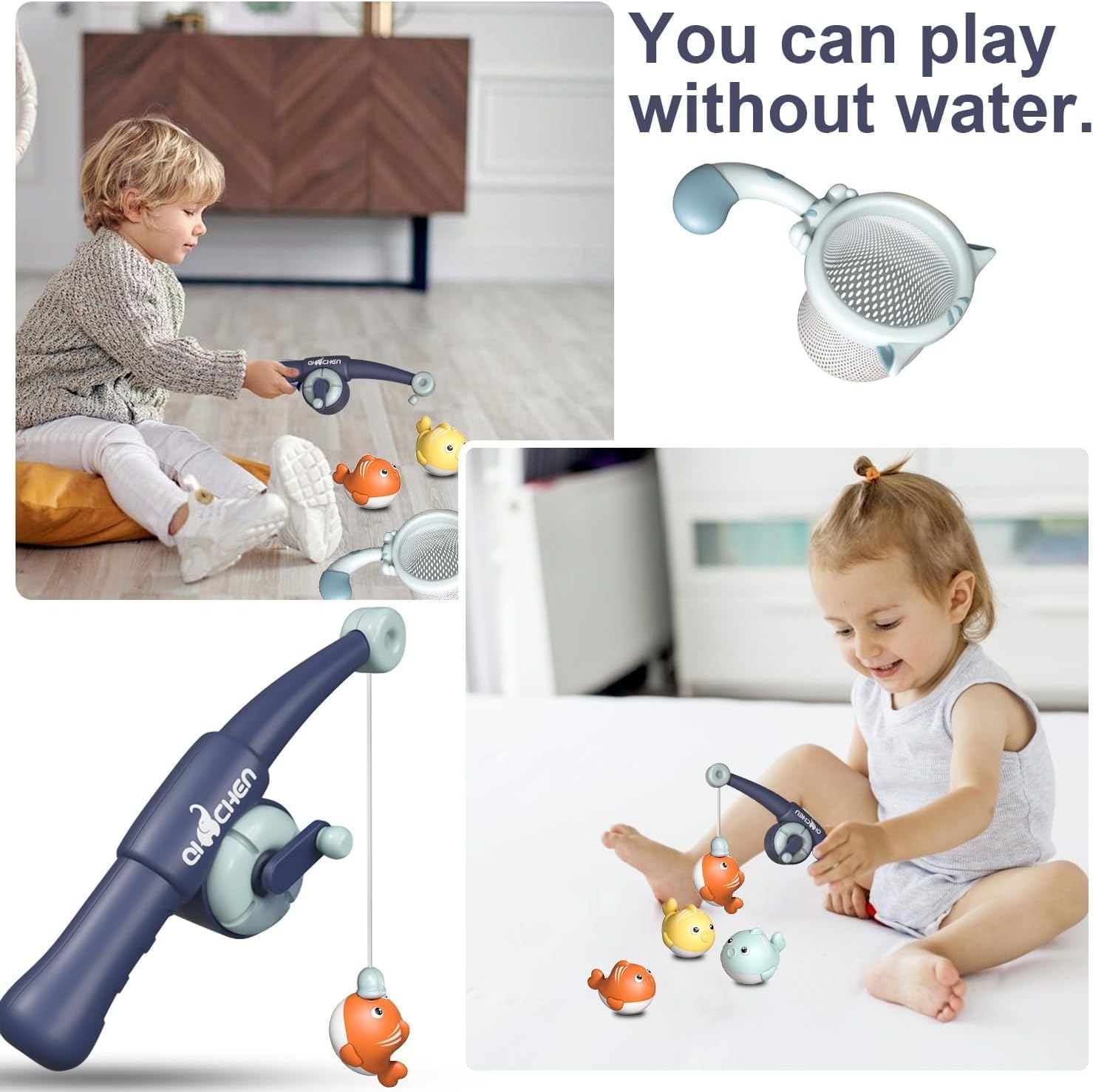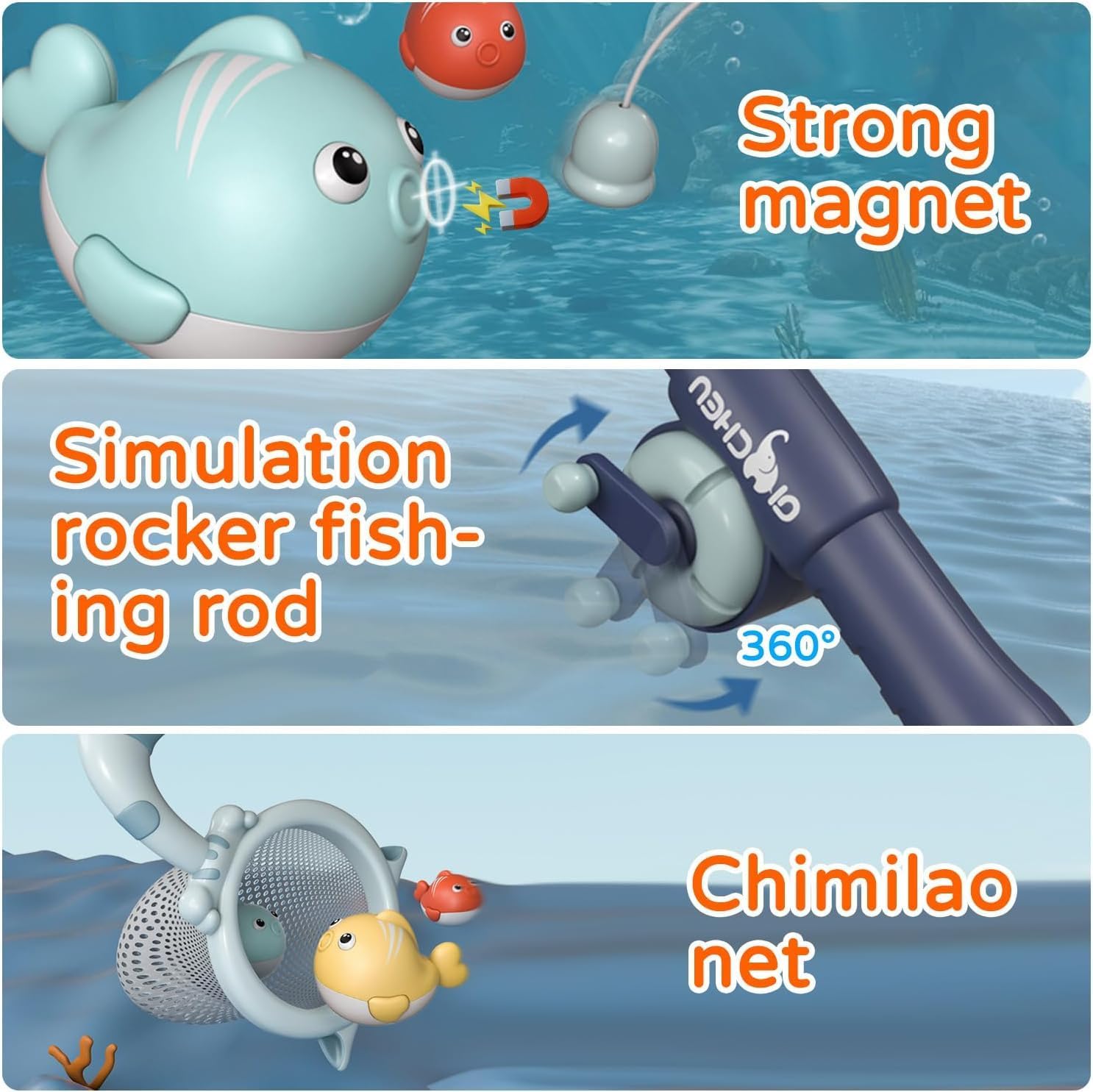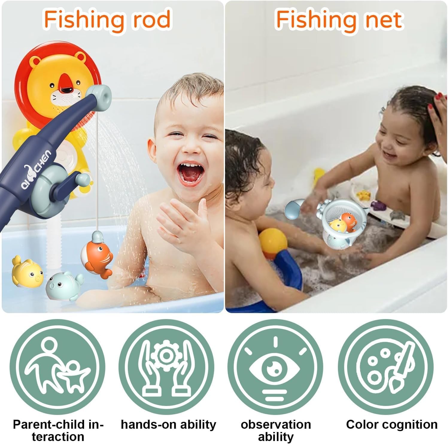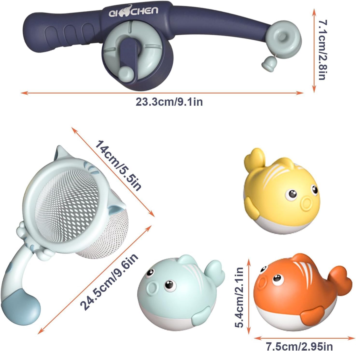 【Magnetic Fishing Games Bath Toys】Bath toy set contains 1*magnetic fishing rod, 3* clownfish and 1*fishing net. Characters float with magnets on top for easy fishing. Children can also fish the cute sea creatures with the fishing net from the bath water.