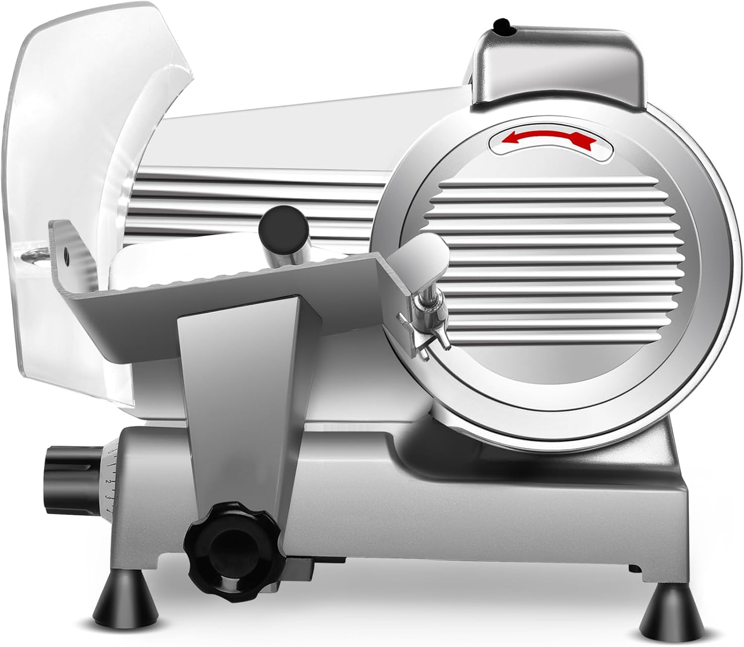 Precise & Adjustable Thickness Our meat slicer machine for home is equipped with a thickness adjustable knob, so you can easily adjust the slice thickness from 0 to 13 mm accurately. This feature ensures precise and even cuts, making it perfect for cutting meats, vegetables, cheeses and fruits.