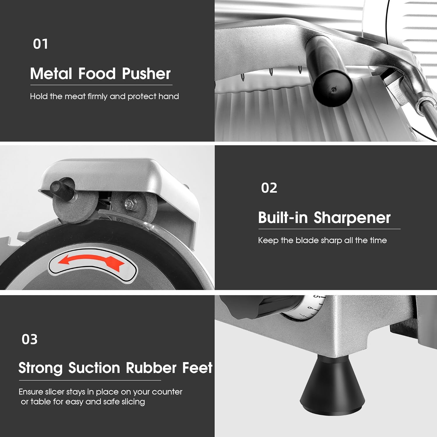 Safety Protection Design Our cutter machine is equipped with a sharpener, which can be safely sharpened without removing the blade. A fixed transparent shield can prevent unintentional contact with the blade to ensure safety. The on/off switch and relays are built separately, which can prevent them from being damaged together at the same time. Non-slip suction cup feet keep the electric clipper stable during work. A food pusher to firmly hold the meat and a handle for easy operation.